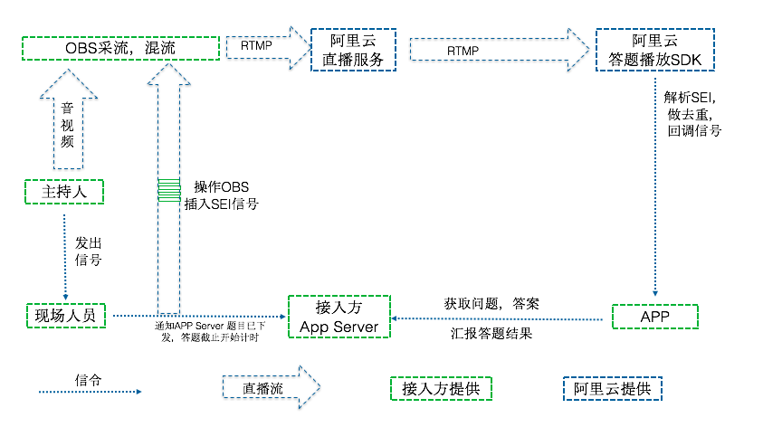 直播答题通过推流SDK、定制版OBS或者阿里云OpenAPI在直播流中插入SEI信息(题目信息),当播放器解析到SEI信息后,会回调给用户的App,此时用户就可以将题目的具体题目内容展示出来。具体流程如下: