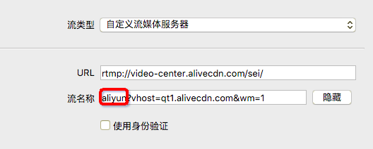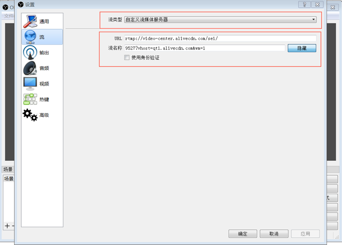 2、选中左侧 流 选项,设置Rtmp推流地址。以中心推流地址举例:完整的推流地址是rtmp://video-center.alivecdn.com/sei/stream01?vhost=qt1.alivecdn.com。其中,推流URL填写为阿里云提供的推流地址中appName前面部分,如rtmp://video-center.alivecdn.com/sei/,流名称为阿里云提供的推流地址中streamName后面部分(含鉴权信息),如{streamName}?vhost=qt1.alivecdn.com,{streamName}可根据业务情况进行分配设置。