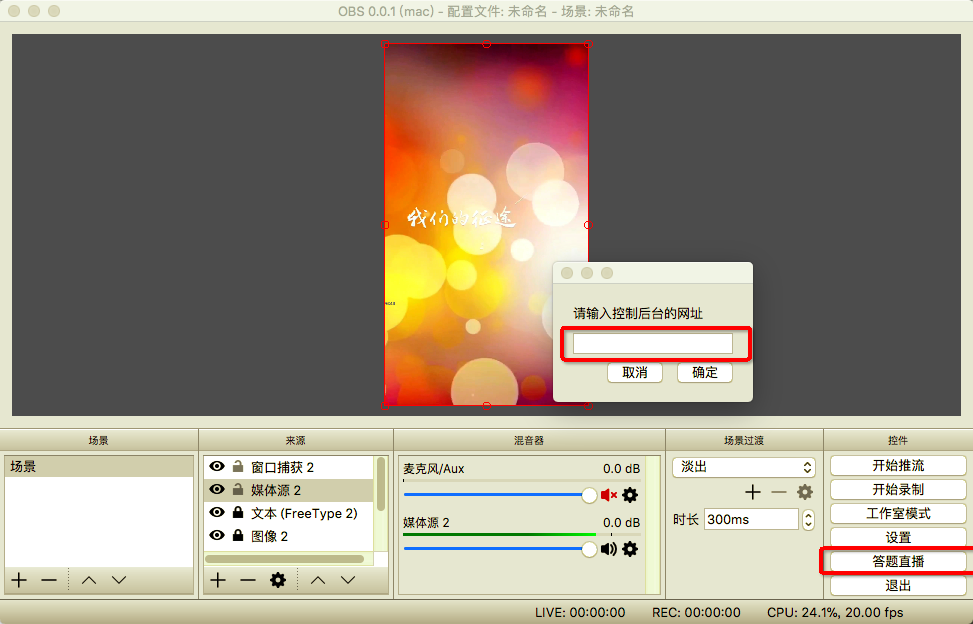 在OBS界面右下角,单击直播答题按钮,并在弹出的对话框中填入答题网页地址,加载出答题页面。streamName的值应该与OBS设置的流名称保持一次。每次测试的时候最好换用不同的streamName。